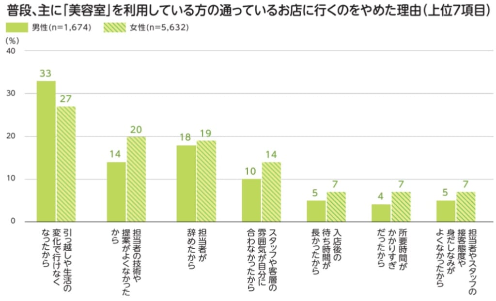 厚生労働省の調査においても、美容室に行くのをやめた理由として「担当者の技術や提案が良くなかったから」という理由は、女性において2位(男性は3位)となっています。