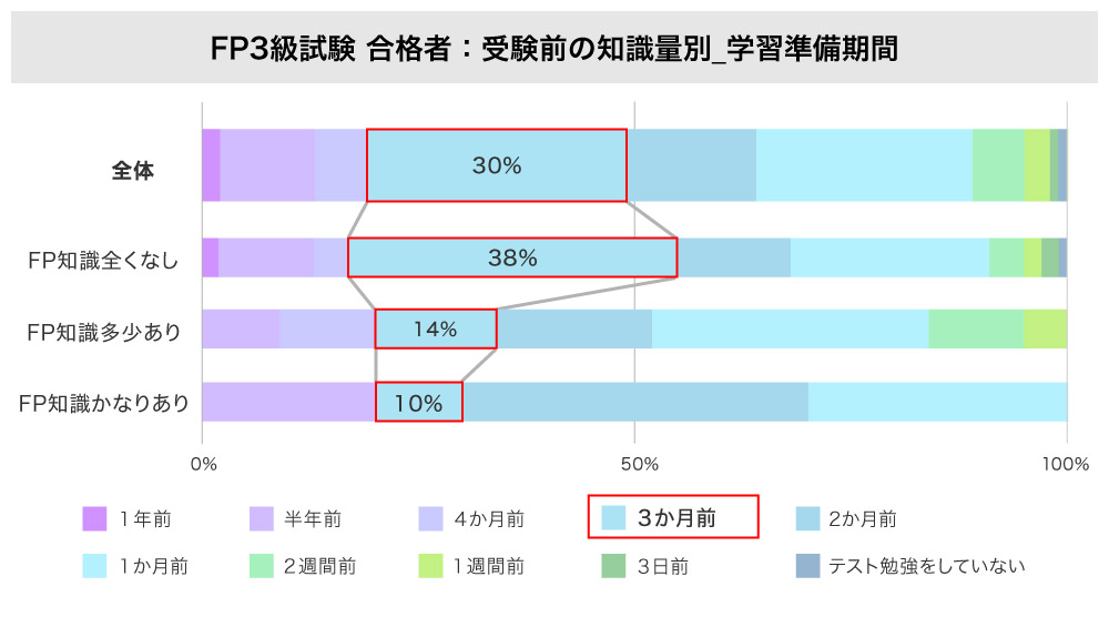FP3級試験対策を開始した時期について、全体では「3か月前」と答えた人が最多に。![]() FP3級試験受験前のFP知識別に集計すると、 受験前のFP知識が「かなりあり」「多少あり」と答えた人では「2か月前」または「1か月前」が最多ですが、「全くなし」と答えた人では「3か月前」が約4割とトップに。 |