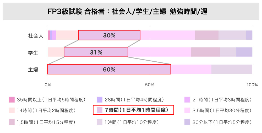 同アンケート結果によると、1週間に7時間、1日平均1時間の勉強を約3か月続けて、FP3級試験に合格した人が多いようです。