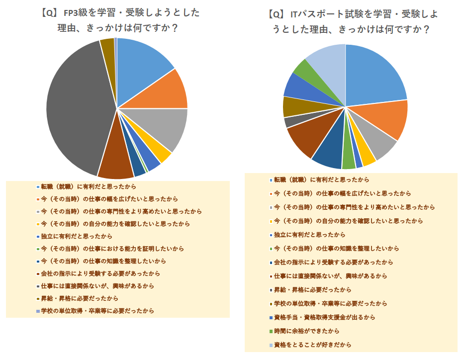 まず注目すべきはFP3級を受けた理由。全体の4割が「仕事には直接関係ないが、興味があるから」と答えています。ITパスポートの同様のアンケートと比較しても、FPは知識の習得を目的とする人が多いことがわかります。