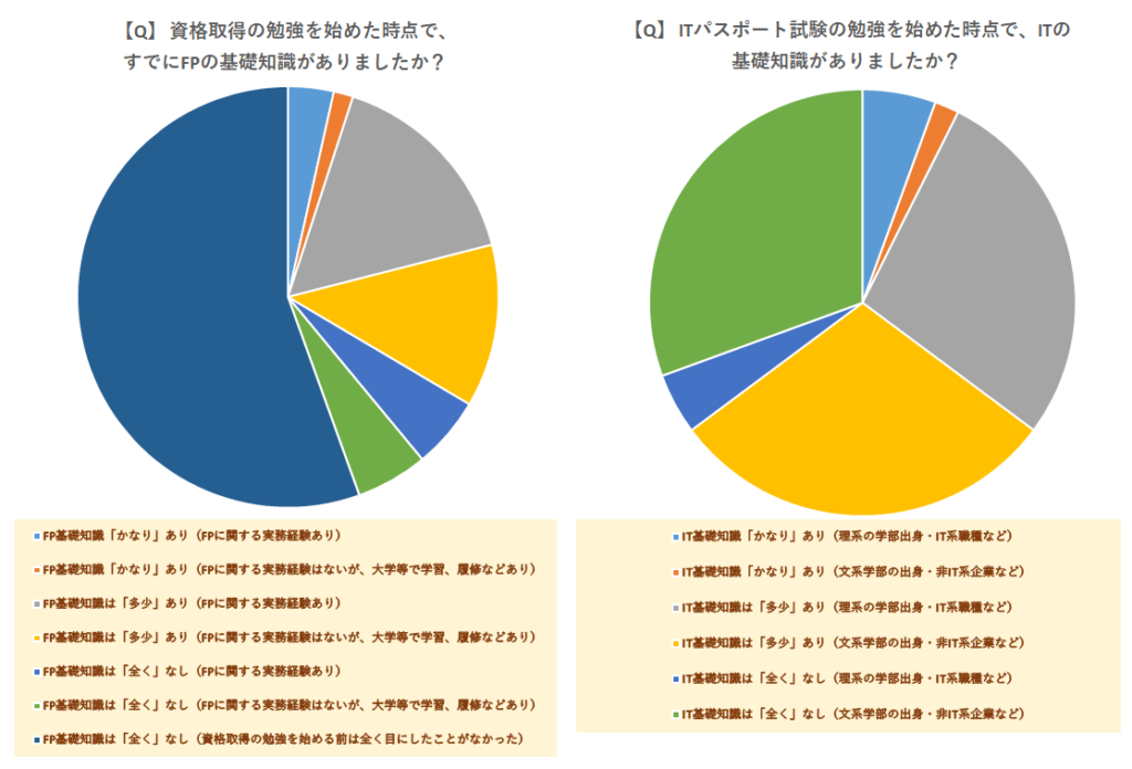 試験の学習時間についてはITパスポートは「1か月前」に開始する人が多いところ、FP3級は「3か月前」から学習する人が多く、必要勉強時間はITパスポートよりも多くなると思って良さそうです。ただ上記は「1日何時間勉強したか」でも大きく事実が異なるため、3か月勉強すれば…というものではないのでご注意ください。