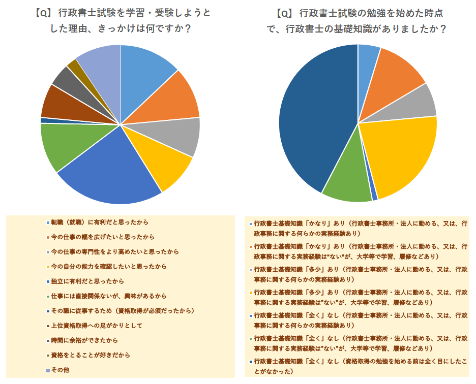 本アンケートデータを見るとおよそ50%人が「基礎知識が全くない」状態から勉強を始め、40%の人が「転職」「独立」のため受験し合格しています。行政書士は難関資格ではありますが、法務系資格の中では比較的取りやすい位置づけのため、知識がない状態からでもしっかり学習していけば合格できると言えるのではないでしょうか。