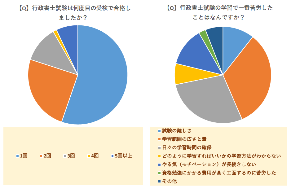 行政書士試験の合格率は公表されており、例年10%強となります。そのデータから考えるとアンケート回答者の皆さんは凄く優秀ですね。この乖離は「合格者に聞いたから」であり、合格する力のある(知識量が合格水準に達している)人はおよそ5割強が初回受験で合格していると捉えてください。