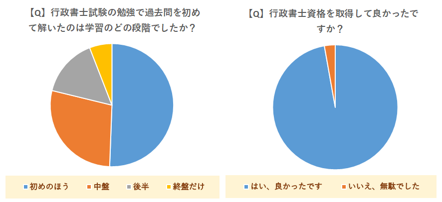 おまけで、過去問に取り組む時期は半数の人が学習開始初期から行っていたようです。