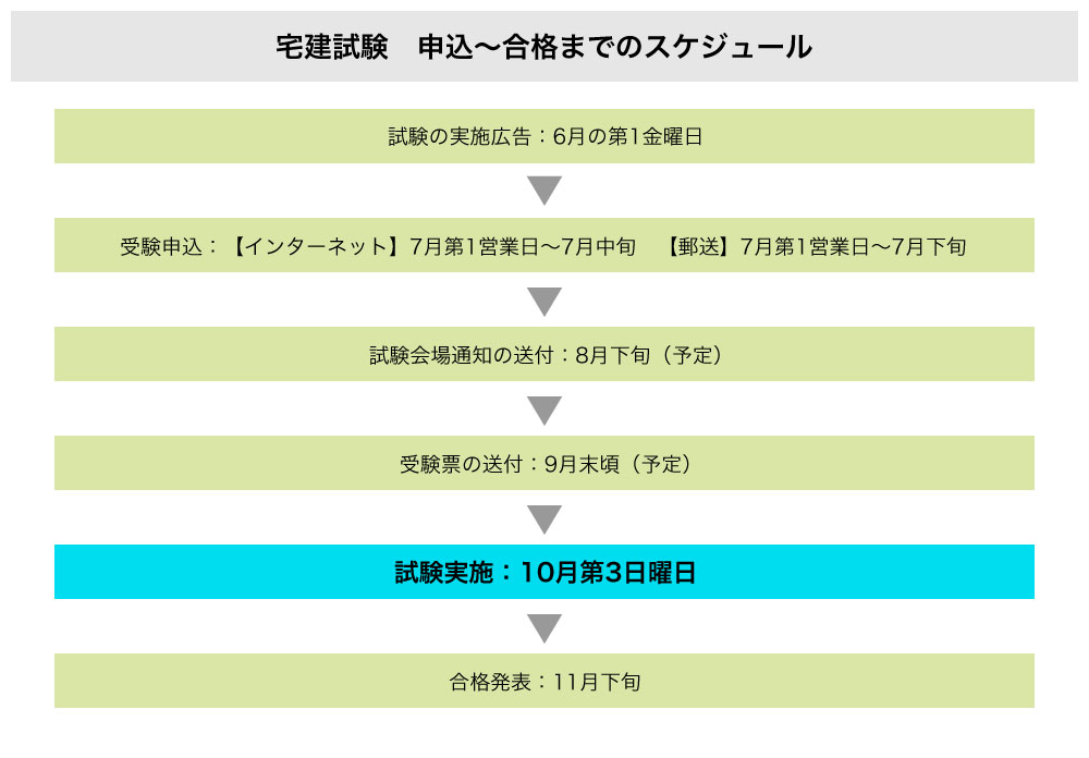 宅建試験は、7月に受験申込を行い、原則10月第3日曜日に実施されます。